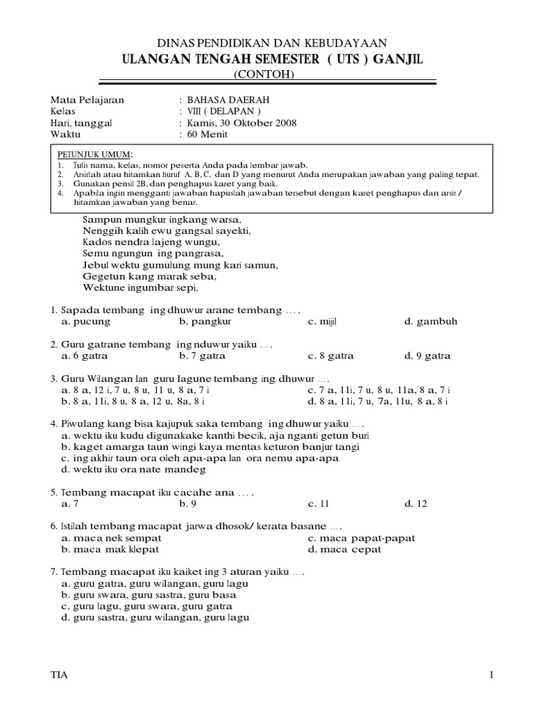 Yen dadi nom, den weruh ing enomipun dene ingkang tuwa den kaya banyu ing beji den awening paningale aja samar manawa dideleng saka paugerane, tembang ing ndhuwur iki tembang pocung. Guru gatra, guru basa, lan guru wilangan d. Cacahe wanda (suku kata) saben sagatra ing tembang macapat diarani. 10i, 6o, 10e, 10i, 6i, 6u 6. Tantri basa kelas 6 kaca 60 a. Yeku patut tinulad tulad tinurut, sapituduhira, aja kaya jaman mangkin, keh pra mudha mudhi dhiri rapal makna. Tembung geguritan asale saka tembung gurit. Guru wilangan lan guru lagu gatra katelu ana tembang ing ndhuwur yaiku. Miturut bausastra jawa, geguritan iku karangan kang pinathok kaya tembang, ananging guru gatra, guru wilangan lan guru lagune ora ajeg. Guru gatra yaiku cacahe larikgatra saben pada bait. Gatekno tembang ing ngisor iki! Guru lagu tembung pangkur yaiku a, i, u, a, u, a, i. Pada, guru gatra, guru lagu, guru wilangan.