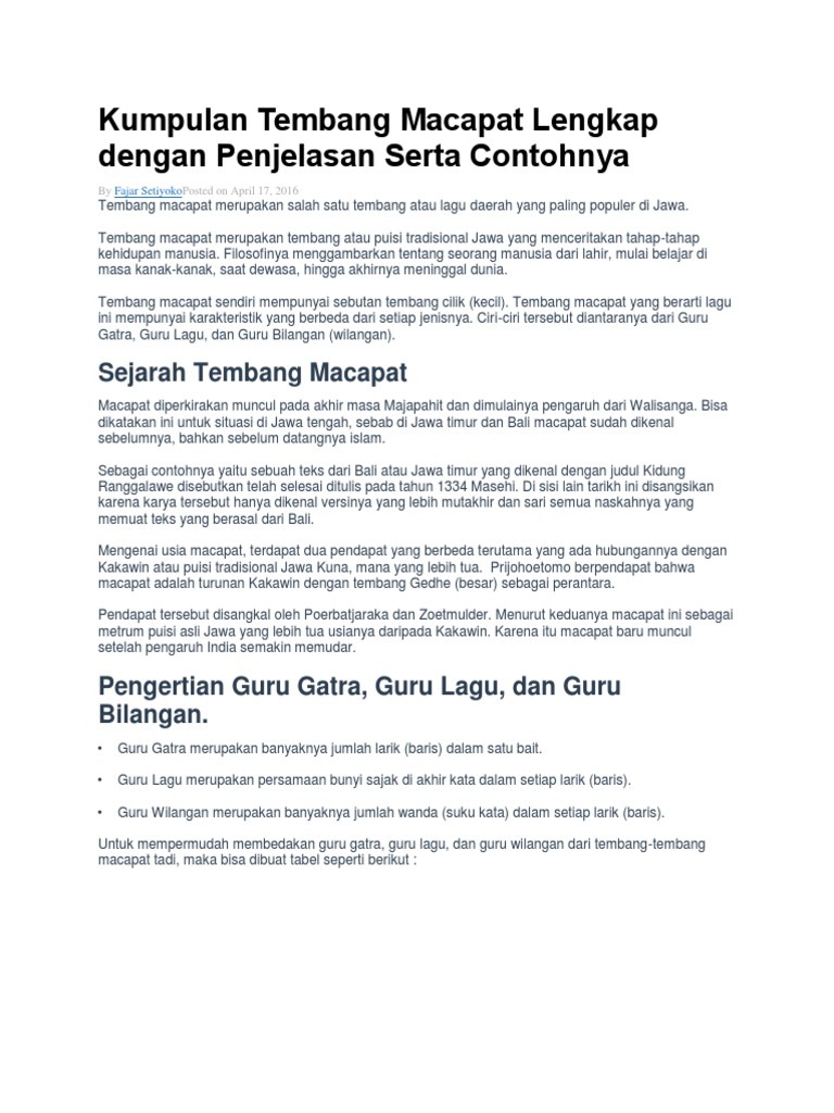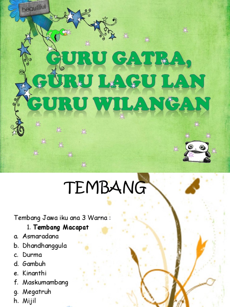 Kanggo luwih cethane ngenani jinise tembang, 98 kirtya basa vii. Buku pengayaan bahasa jawa siswa kelas 10a Kang dikarepake ukara kang cinatur polah kang kelantur yaiku. Buku pengayaan bahasa jawa siswa kelas 11b 7 42 paugeran guru wilangan lan guru lagune saka tembang kinanthi ing dhuwur yaiku. Paugeran sajroning tembang macapat iku ana telu, yaiku : 3) guru lagu yaiku tebaning swara ing pungkasaning gatra. Guru gatra, guru wilangan, lan guru lagune bisa dideleng ing tabel ngisor iki : Guru wilangan yaiku cacahing wanda ing saben sagatra. Setitekno tuladha ing ngisor iki! Guru lagu, yaiku tibane swara wanda pungkasan ing saben gatra. Guru lagu yaitu jatuhnya persamaan bunyi sajak dalam setiap larik (baris). Pada, guru gatra, guru lagu, guru wilangan.