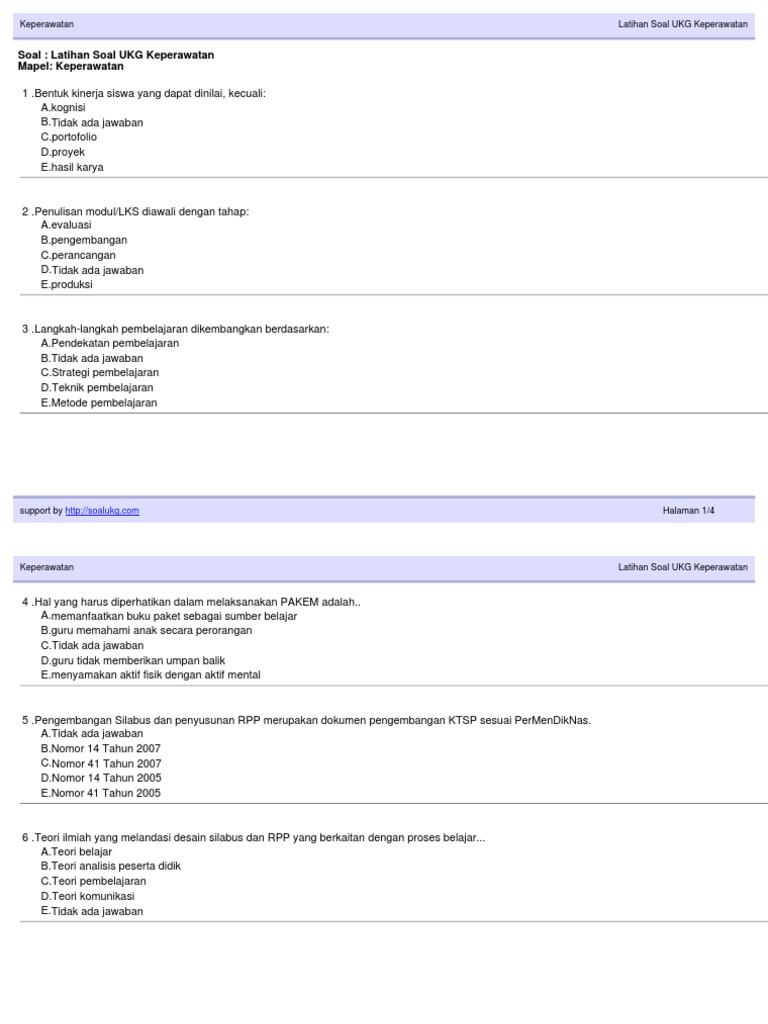Get contoh soal ukg sd dan kunci jawaban pdf images.oh iya hampir terlupa pada poin contoh soal tes wawasan kebangsaan diatas kami berikan kunci jawaban dari contoh soal itu, jawabannya adalah d, terima kasih dan silahkan dibagikan jika ini bermanfaat. 10 full pdfs related to this paper. Diharapkan soal ukg guru tk / paud ini bisa berguna bagi guru yang pada tahun 2021 mendatang akan. Www.hadisetyo.com ukg 2015 soal uji kompetensi guru (ukg) penjaskes 100 soal 1. Guru profesional dituntut memahami karakteristik peserta didiknya agar dapat mencapai hasil yang optimal.